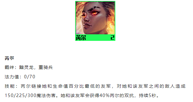 2、芮尔羁绊是黯灵龙、重骑兵,最大法力值为70,初始法力值为0。