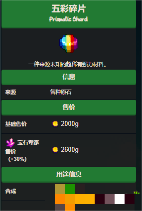 1、五彩碎片 (Prismatic Shard)是游戏星露谷物语中的一种矿石,也是游戏中最少见的物品之一。