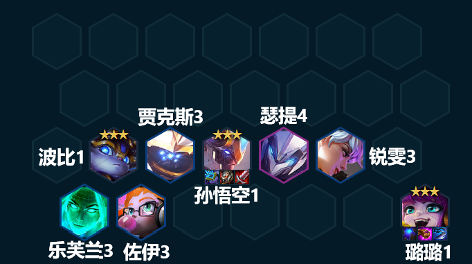 阵容组成:波比、贾克斯、孙悟空、瑟提、锐雯、乐芙兰、佐伊、璐璐