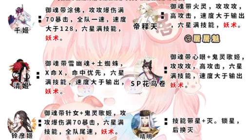 2、卷帝群攻阵容:千姬+帝释天+清姬+SP花鸟卷+铃彦姬+晴明;