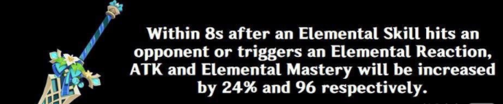 属性效果为:在元素技能命中一个元素或触发元素反应后的8秒内,攻击力和元素精通将分别提高24%和96%。