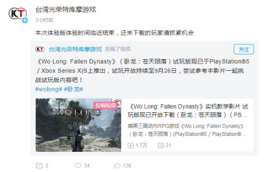 《卧龙:苍天陨落》的试玩版于9月16日在PS5和XSX|S平台推出,开放持续至9月26日。参与试玩的玩家只要通过体验关卡即可获得能在正式版中使用的装备道具“卧龙兜鍪”,而通关的玩家还可获得两张精美壁纸。