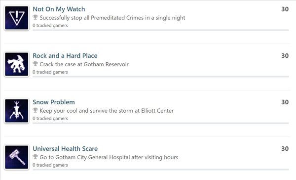 此外,玩家还需要阻止250场犯罪活动、完成16个训练场所、把蝙蝠家族每个角色都升到顶级、解锁他们的所有动作技能、在一个夜晚阻止所有的预谋犯罪、制作一整套传奇装备等。最后才能拿到白金奖杯。
