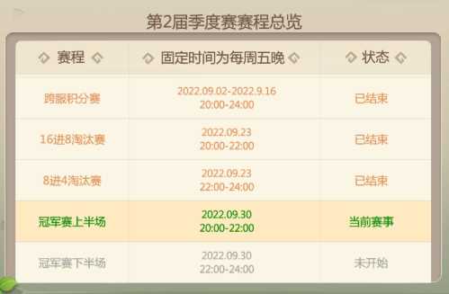 石器时代季度赛冠军赛赛制为三局两胜淘汰赛,上半场将在本周五9月30日晚上20:00-22:00进行,4名选手需要在20:15前入场,赛后胜者将在下半场进行手游冠军赛,败者则进行季军赛;石器时代季度赛冠军赛下半场:冠军赛和季军赛,将在本周五9月30日晚上22:10-24:10进行,选手需要在22:25前入场,三、四名选手争夺季军,一、二名选手争夺冠亚军,最后选出本届季度赛的跨服最强原始人!