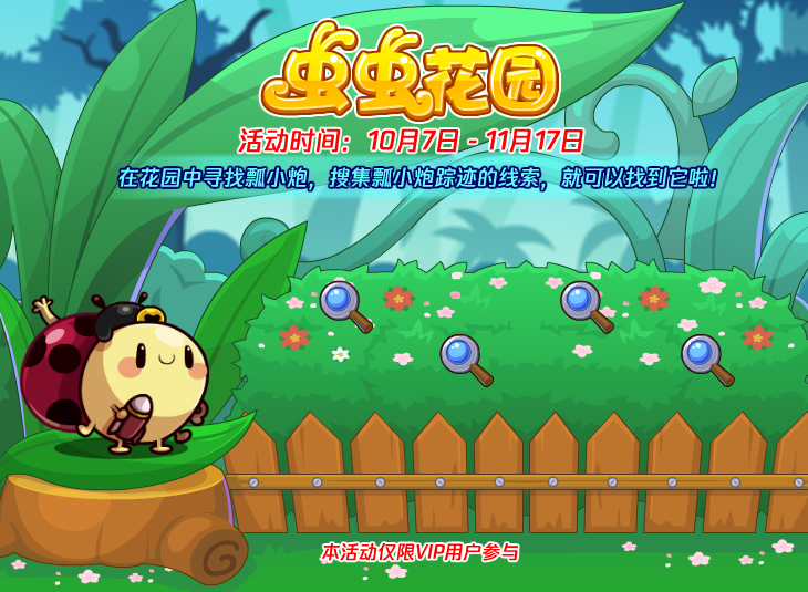 在花园中寻找瓢小炮,搜集瓢小炮踪迹的线索,就可以找到它啦!(本活动仅限VIP用户参与)