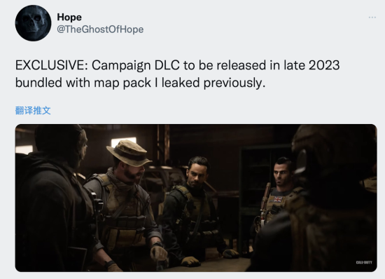 今日,《使命召唤》博主Hope在推特透露,根据自己的独家消息,COD战役DLC将于2023年年底发布,和之前的透露的前代经典地图一同发布。