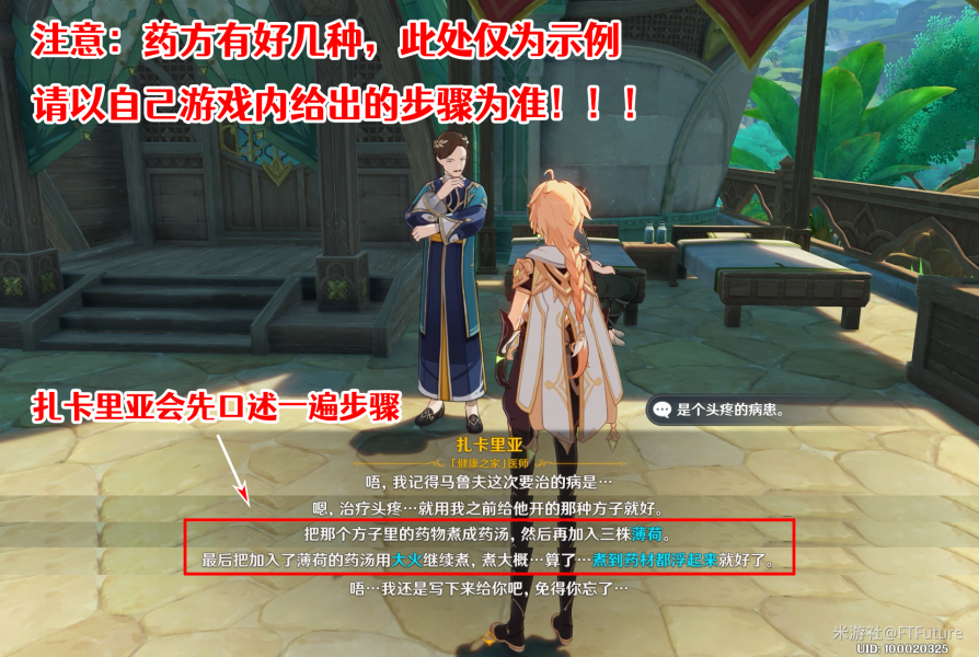 扎卡里亚会根据不同的症状开出不同的药方,在给我们口述药方的时候,游戏内文本会用蓝色字体标注出药方的关键信息,我们要仔细记好步骤。(步骤有多种分支,下图仅为其中一种,要以自己游戏内遇到的为准!)