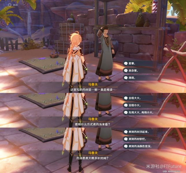 拿到扎卡里亚开的药方后,我们回到阿如村向马鲁夫回报,我们需要按照药方记述的内容分别告诉他药材名称、煮药方式以及煮制时间,三个内容全部回答正确,任务完成后就能获得成就。