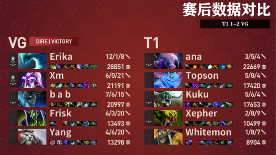 决胜局中,Xm的紫猫前期顶起了局势,帮助水人追上了经济,Fade的拉比克再现巅峰表现,全场牢牢盯防Topson的帕克,VG凭借着高坡视野扼制了T1的反扑,随后带盾稳稳破三路赢下比赛,VG晋级败者组下一轮,对手为Liquid和XG的胜者。