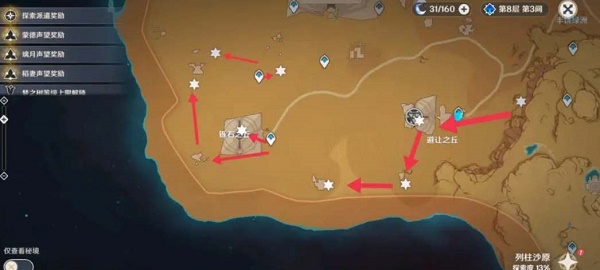 2、左上角的这个神瞳,首先传送到铄石之丘传送点,落地后往遗迹内走,穿过遗迹走廊,正前方的大坑跳下去;