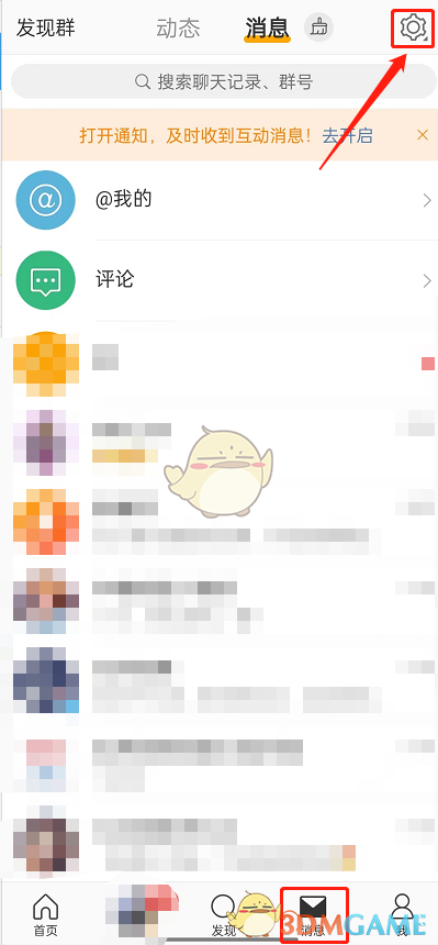 1、打开微博,点击消息,点击右上角设置图标。