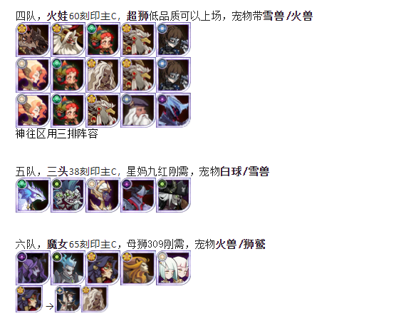 四队,火娃60刻印主C,超狮低品质可以上场,宠物带雪兽/火兽