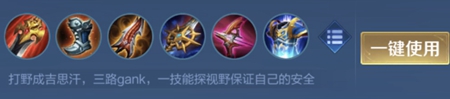 成吉思汗发育较慢可以选择用它来打野,这样可以很快将经济刷起来,不过最好是有辅助的配合,不然很容易被抓。