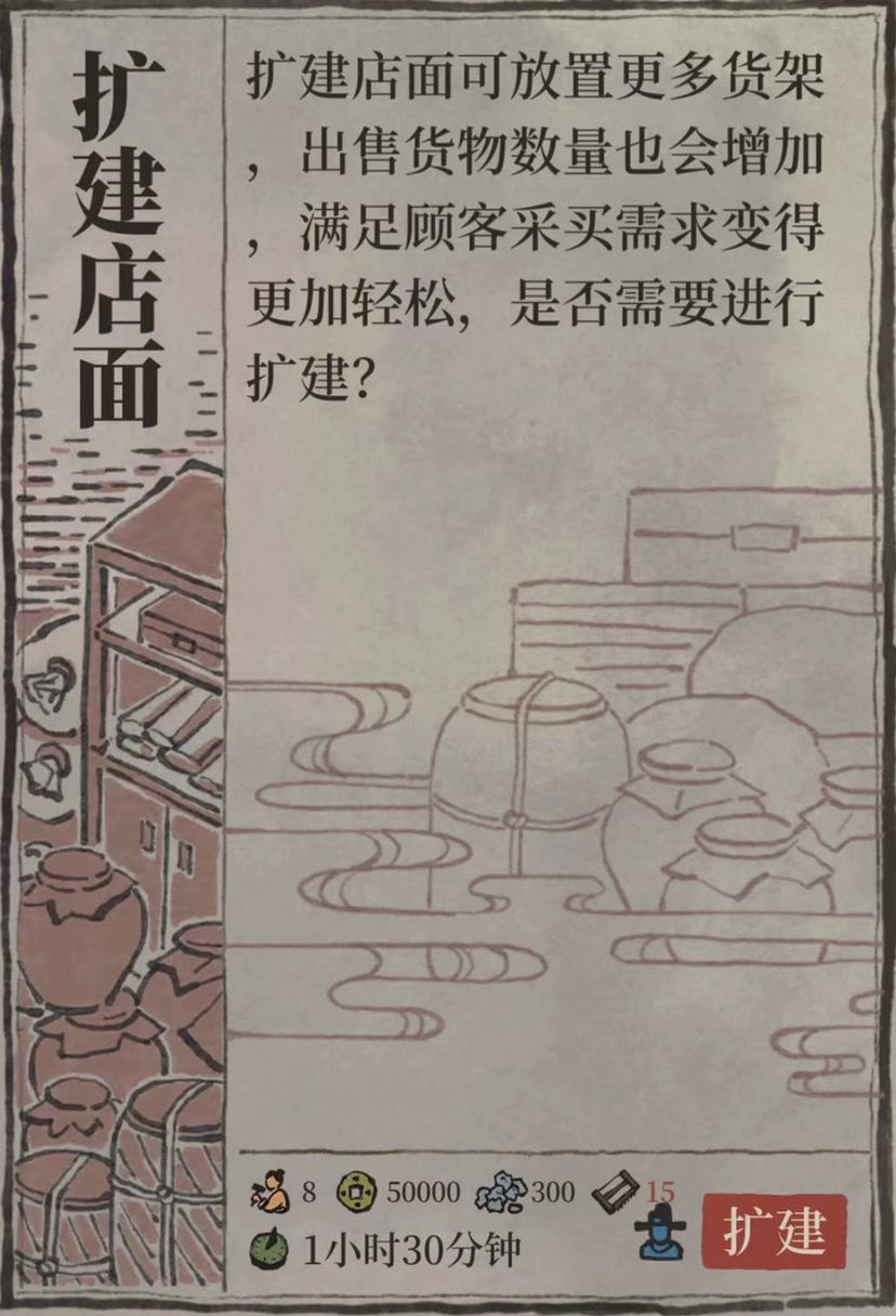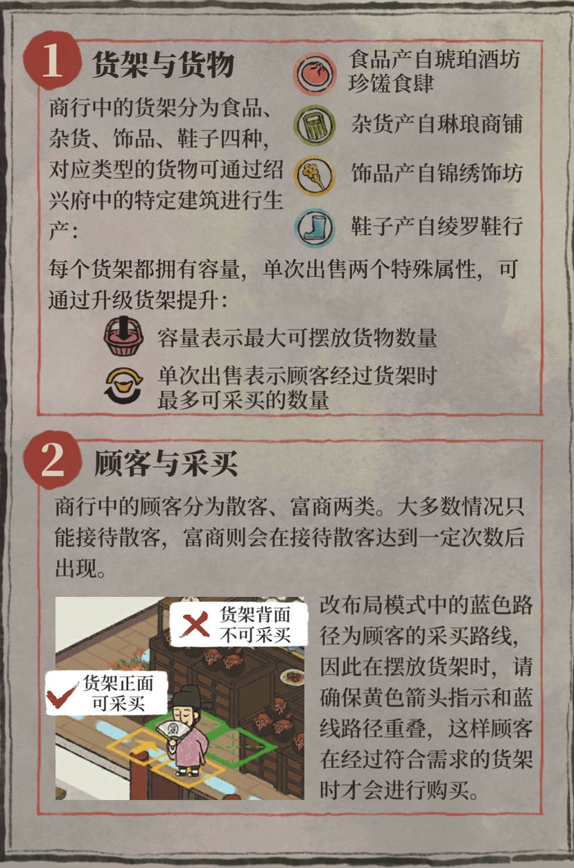 顾客需求:每次顾客访问时间会有倒计时,在商行的左上角可以看到,点击倒计时可以查看这波顾客的具体需求,对于货物匮乏和货架较少的前期来说,可以提前有针对性的生产和摆放货物,提高顾客满意度和收益。注意完美接待和不完美接待的收益差距巨大,特别是对于富商来说,尽量准备充分再点击接客。