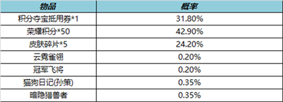 云霓雀翎、冠军飞将、猫狗日记(孙策)、暗隐猎兽者、荣耀积分*50、积分夺宝抵用券*1、皮肤碎片*5。