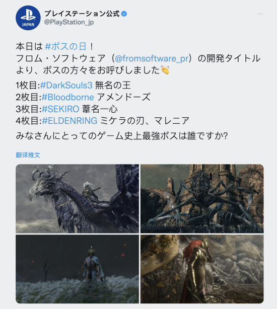 PS官方发文提问 FS社游戏史上最强Boss是谁?FS社是经典的角色扮演魂系列游戏的开发商,在FS社旗下拥有着注入黑暗之魂、血缘、只狼、艾尔登法环等等多种多样的魂系列游戏供玩家们进行体验,在游戏内注重的便是破碎化的叙事加上困难至极但十分有趣的战斗体验,玩家们能够在这里轻松地体验最佳的战斗玩法,丰富的武器和魔法的存在也让这几款游戏拥有着极高的可玩性,在最近PS官方发文FS社旗下游戏之中最强的BOSS是谁。