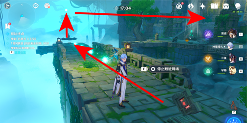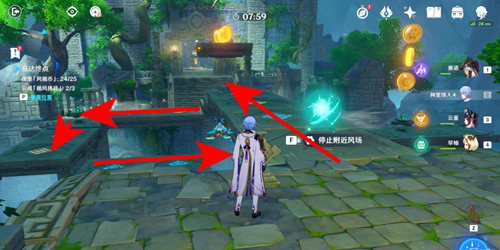3、清理怪物后,记得回头拿风循币!如箭头所示依次将风场朝上,打开机关,解锁第五处风场。