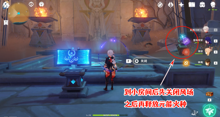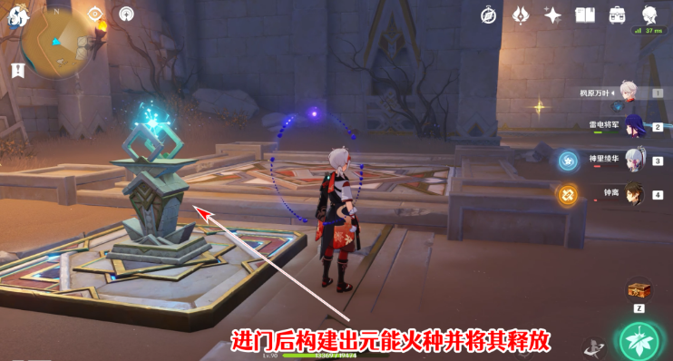 31、来到元能烛台后,通过秘仪台座关闭风场,再释放元能火种,这样就能回到元能火炬中了。