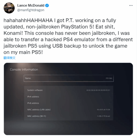 不过近日,有玩家再次成功的在PS5平台上玩到了这款游戏。该用户将一台越狱破解的PS5机器,连上另一台未破解的正常PS5,并在正常的PS5上安装了PKG文件,玩到了《P.T.》。