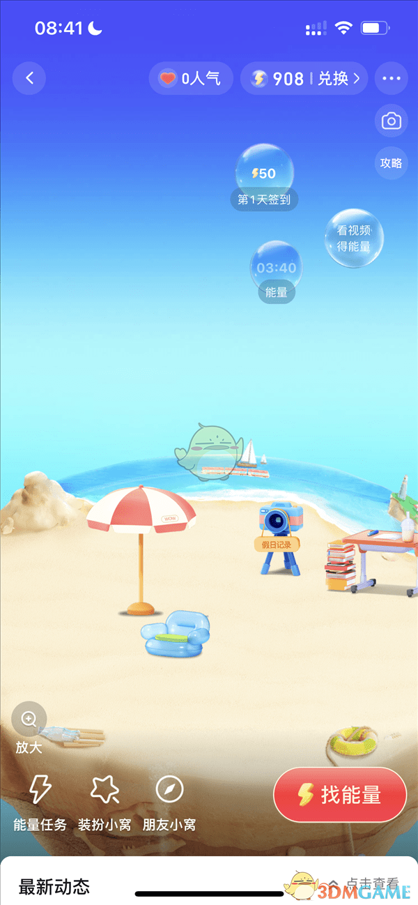 3、用户需要获取能量才能对小窝进行装扮,可通过收取能量气泡、拜访朋友小窝、完成任务等方式获得,获取能量方式主要为观看视频、社交。