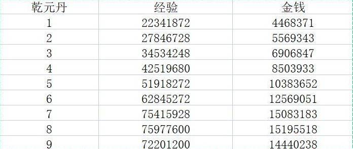 | 等级 | 新乾元丹 | 等价原乾元丹 | 经验 | 金钱 |