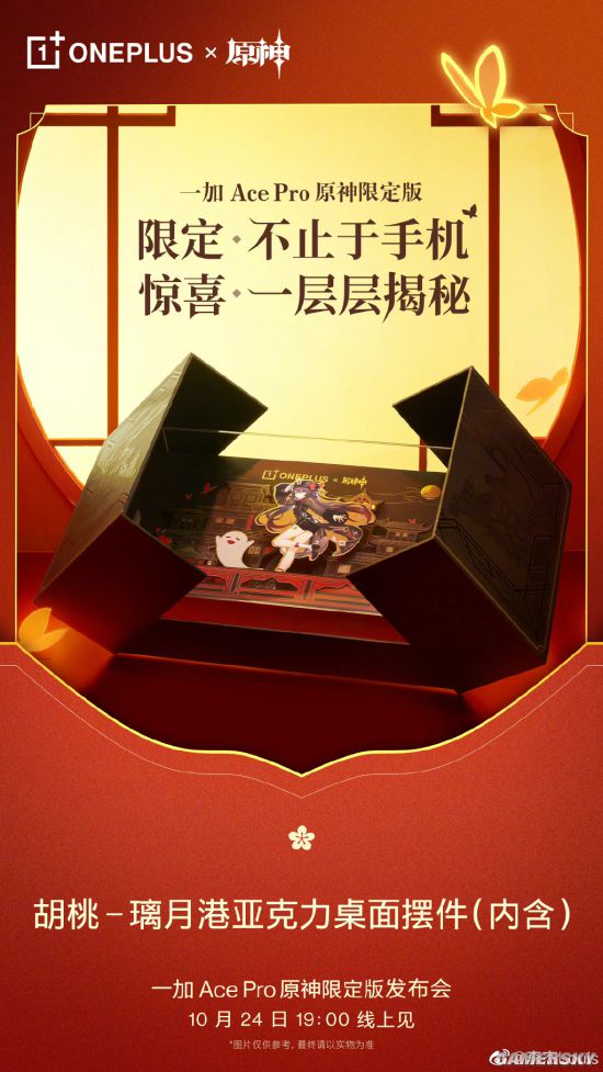 一加AcePro原神限定版的礼盒在设计上非常用心,这是全球首款原神定制手机,凝聚了一加和原神团队很多的创意结晶。比如第一眼打开就是胡桃-璃月港亚力克桌面摆件,既是包装也是精致摆件,这是一次大胆的创新尝试。更多惊喜请大家关注 10 月 24 日晚上 7 点一加 Ace Pro 原神限定版发布会!
