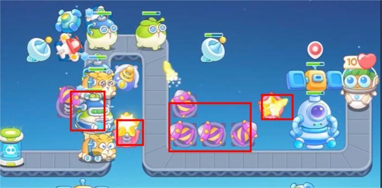 3、玩家可以多安放星星塔,星星塔对地面攻击有范围伤害,对空中只是单体,玩家需要小心太空兔,如下图所示。