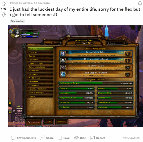 昨天,《魔兽世界》玩家 Lyzosu 在 Reddit 社区发帖晒出自己的欧皇时刻:他在同一天里获得了游戏中最稀有的无敌坐骑和无头骑士坐骑。
