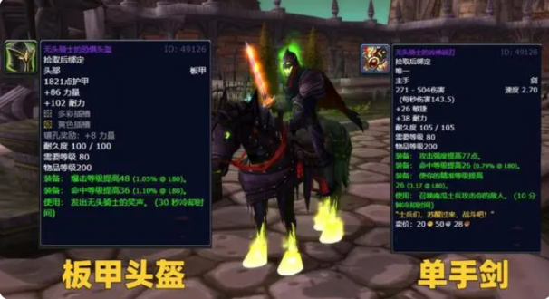 另外2件装备分别是200等级的板甲头盔和单手剑。五人本期间很多板甲玩家都入手了锻造的泰坦头盔,不过依然有部分玩家因为价格的问题没有入手,而节日BOSS掉落的头盔正好可以替代泰坦头盔。