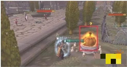 2、进入血色墓地后,直接前往中间的庭院,能够在庭院里面看到一个冒火的南瓜头。