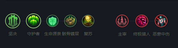 符文加点守护者或者余震、生命源泉、骸骨镀层、复苏,副系终极猎人、恶意中伤