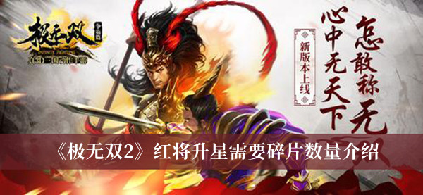 极无双2红将升星需要多少碎片?极无双2是一款竞技冒险类的游戏,在这款游戏中拥有着超级精美的游戏画面,而且整个游戏的场景地图是非常的大的,在这里玩家们可以尽情的进行一系列的精彩的操作,在极无双2中,我们可以看到各种熟悉的三国类策略玩法,在这里玩家也是可以进行一系列的阵容的搭配的,并且整个游戏中的各种画面对战也是超级的精彩刺激!在这里,各种动作的输出也是非常的顺利的!在游戏中,还有着超级丰富的角色,其中的武将就是游戏中的重要战力保障,在游戏中红将升星是需要碎片的,而且所需要的碎片数量还不固定,下面是小编整理的具体数量一览,大家可以参考一下哟~
