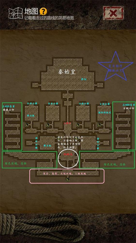 1.精铁/玄铁古印:开大门用的,需要占400负重,背包不够的话去的路上可以先把一部分干粮.材料之类的放在沿路本来就有的尸体/罐子/棺材里(注意被你打死的怪不能放,会没有的),回程的时候可以边走边吃,而且放在里面的东西下次进图也能拿回来,不会丢失的。