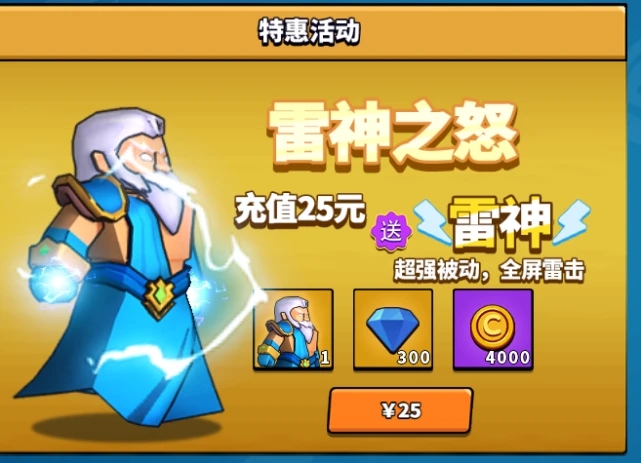 我们在商城中参加特惠活动,花25RMB就能获得雷神之怒,礼包中包含宙斯、300钻石、4000金币,这个活动还是很划算的。