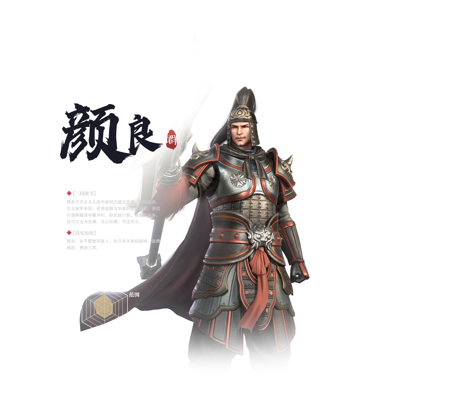 史:颜良,安平郡堂阳县人,东汉末年袁绍部将。晓勇善战,勇冠三军。