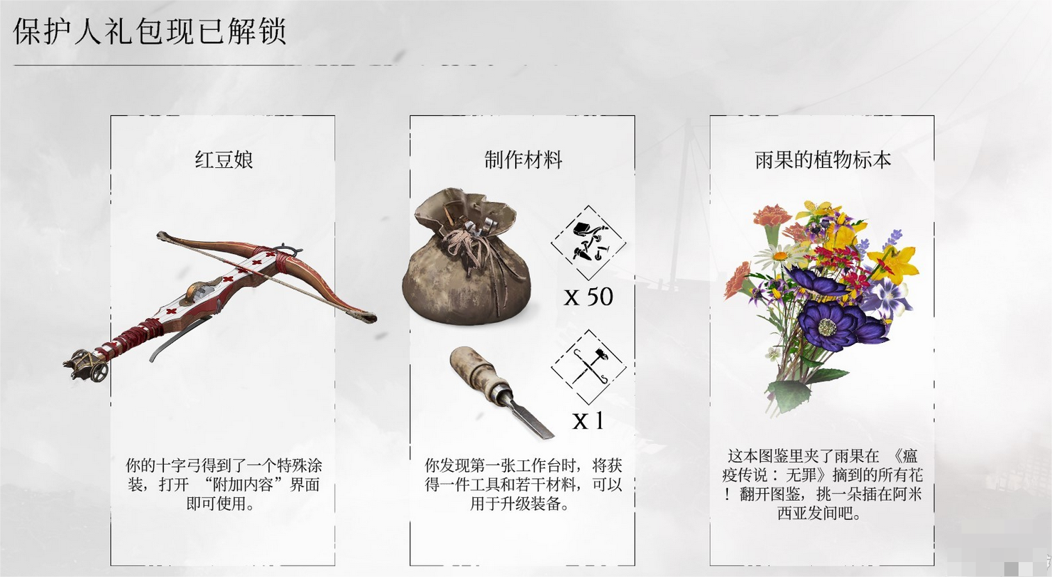 现在预购礼包已经改名成为“保护人包”DLC了,可以单独购买。其中包括:特殊的弩皮肤“红豆娘”、额外的制作材料、阿米西亚专属外观(即雨果的植物标本)。