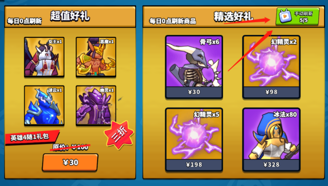 我们可以在商店中氪金购买金卡英雄,如果没有想要的英雄熊猫萌萌,我们可以通过看广告刷新,来获得我们的想要的英雄