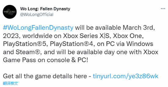 《卧龙:苍天陨落》官方发推,确认将于2023年3月3日发售,登陆X1/XSS/XSX/PS4/PS5/PC平台,首发加入XGP。