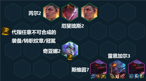 尽快上八,大搜找出2星斯维因阵容就基本成型,根据来牌情况考虑上多个芮尔/厄斐琉斯送死,有第二个2星乌鸦也可以上场,先在8级把阵容整体都搜到2星后,考虑卡利息追3星的狮子狗和3星乌鸦,肉装可以给芮尔消化。后续有机会上九看发牌情况变阵补充阵容上限,一般情况下会选择单挂2星橙卡如:巴德、亚索、索拉卡,也可以多上一个黯灵龙单位传递黯灵精华。