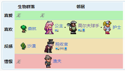 在泰拉瑞亚1.4版本以后,NPC对其他NPC或所生活的生物群落都有各自的偏好,这些会反过来影响他们的商品出售或者提供服务的价格。这就是所谓的好感度。
