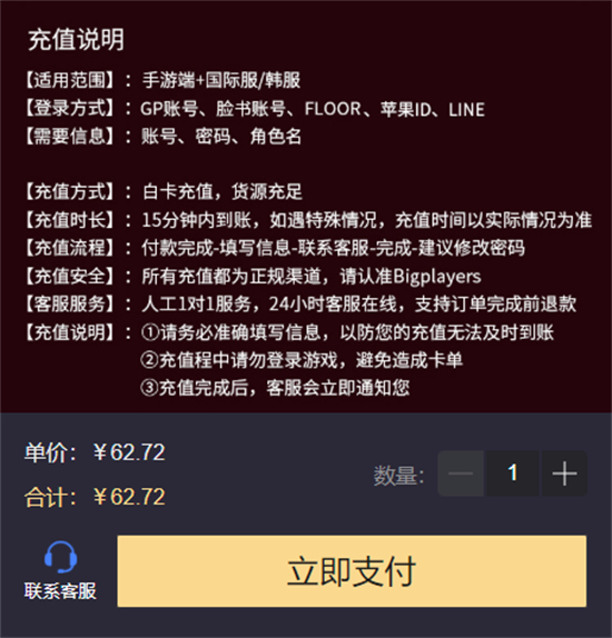 第四步:付款完成后,填写好充值所需的账号信息,并联系人工客服完成充值。