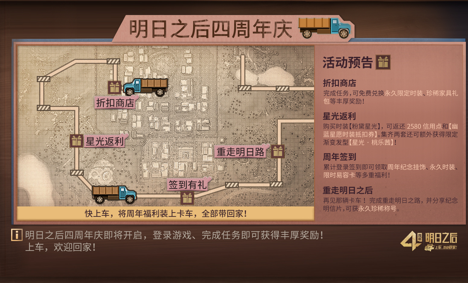 周年庆福利第四弹:重走明日之路!还记得当初进入明日世界时的卡车吗?还记得那个说着“往这边来”的他吗?完成重走明日之路,并分享纪念明信片,即可获得永久珍稀称号!