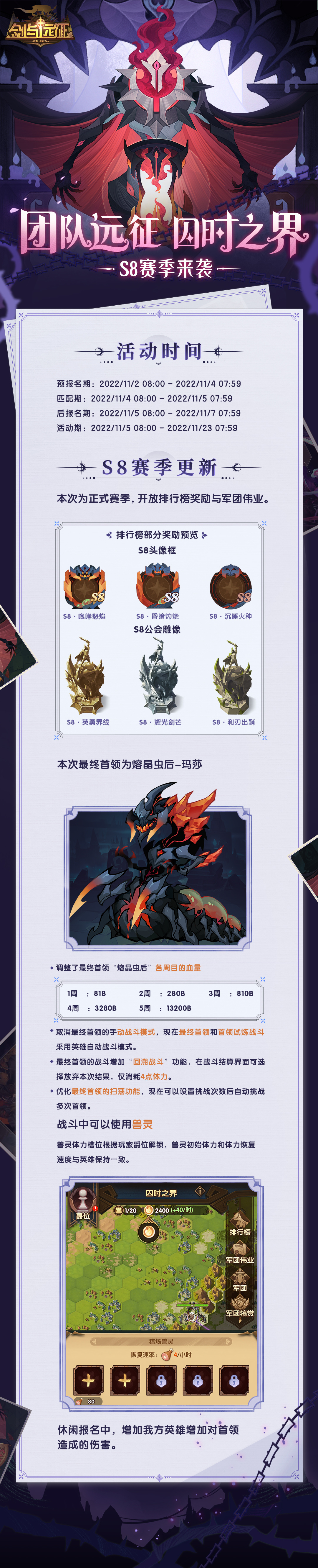剑与远征团队远征S8赛季有哪些内容?团队远征S8赛季更新内容一览,剑与远征是一款超高人气的轻卡牌手游,而剑与远征团队远征S8赛季即将开启,许多小伙伴还不知道这个赛季的奖励以及规则是什么,下面小编给大家带来剑与远征团队远征S8赛季的更新内容一览,一起来看看吧。