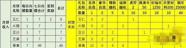 剩下五仁5个换虎符10.剩下蛋黄31个换77.5万铜币,火腿、豆沙、芝麻各1个换兵营材料200、推演令50、祈福币1250