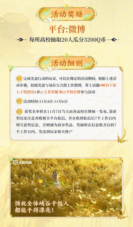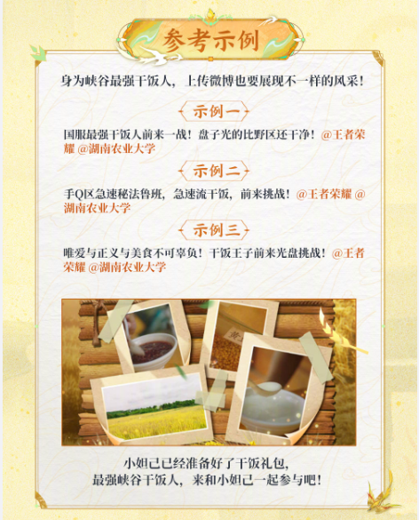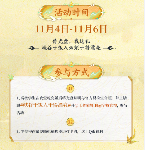 学生上传光盘与易拉宝合照发布微博,并带上#峡谷干饭人干得漂亮#话题,@王者荣耀和@学校官博,即可获得王者荣耀为峡谷干饭人准备的专属奖励,让我们一起在这场光盘行动中,干得漂亮!