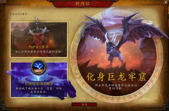 第一赛季开启:PVP第一赛季单排轮斗、史诗钥石第一赛季、化身巨龙牢窟团队副本
