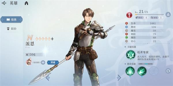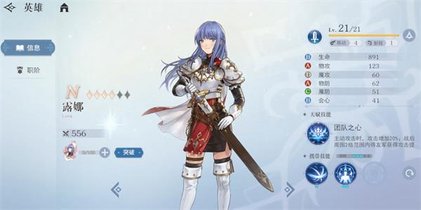 天赋-团队之心:主动攻击时,攻击增加10%;战后周围2格范围内得友军获得攻击提升15%的效果,持续1回合。