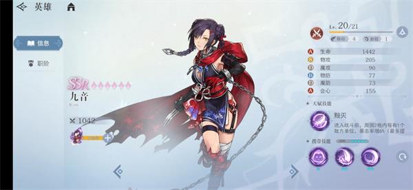 天赋-夜影之舞:进入战斗前,周围2格内每有1个敌方单位,暴击率增3%(最多提高9%);成功消灭敌方单位后可以获得一次额外移动的机会。