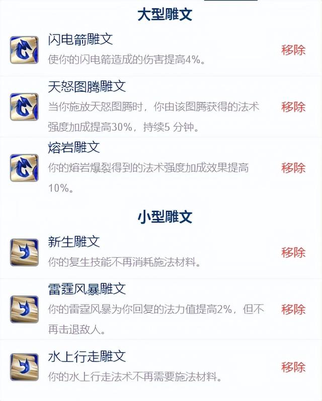 2、雕文:75级以前大型雕文可以选择: 闪电箭雕文和天怒图腾雕文, 等80级以后解锁第三雕文位置以后打熔岩雕文。小型雕文方面可以根据自己需求选择,没啥影响。