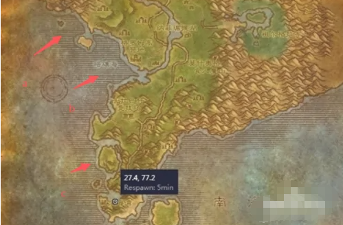 7、荆棘谷海岸线巡视一遍,了解玩家分布状态,从下图A、B、C三条路线中确定最终的选择。(在别人不熟悉的地方钓鱼。这个说起来容易做起来难)最后,祝大家好运气胜出这个比赛吧!